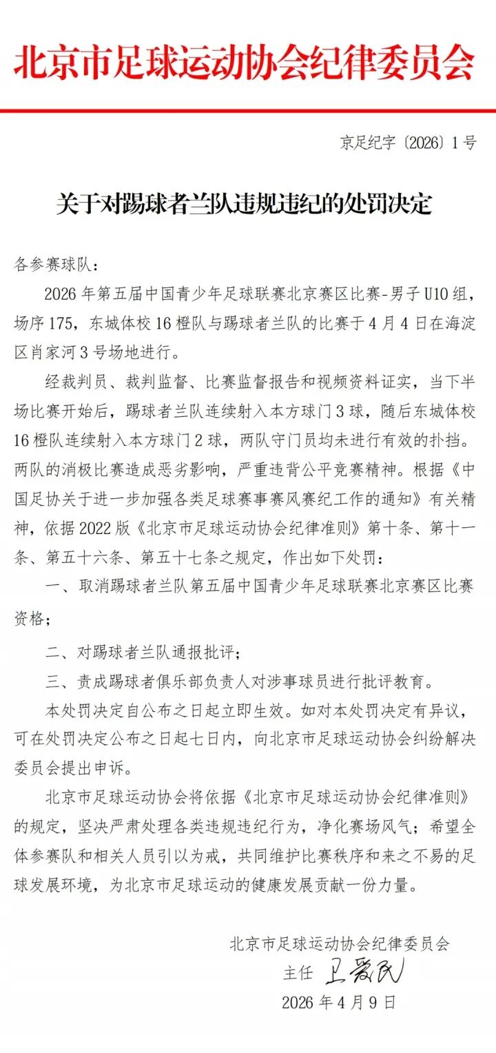 北京足协公告中表示,2026年第五届中国青少年足球联赛北京赛区比赛男子U10组东城体校16橙队vs踢球者兰队的比赛下半场,踢球者兰队连续射入本方球门3球,东城体校16橙队连续射入本方球门2球。